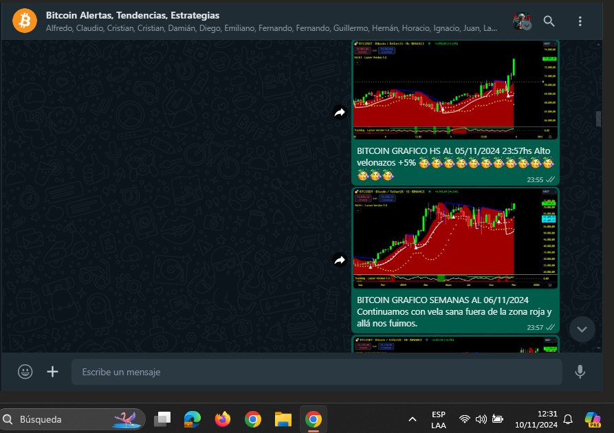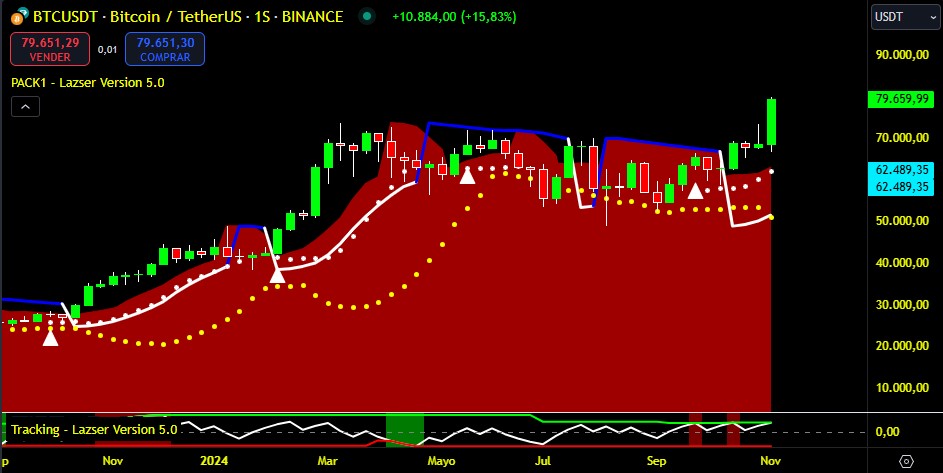 Este 2024 tuvimos el placer y orgullo de haber comprado Bitcoin a las 1AM del 05/11/2024 (día de eleccciones que salió victorioso Donald Trump), nuestros indicadores nos alertaban que ese martes tendríamos una vela verde en el SP500, aunque nuestros indicadores ya nos venían alertando desde la semana del 07/10/2024 que Bitcoin venía alcista, vea el gráfico.