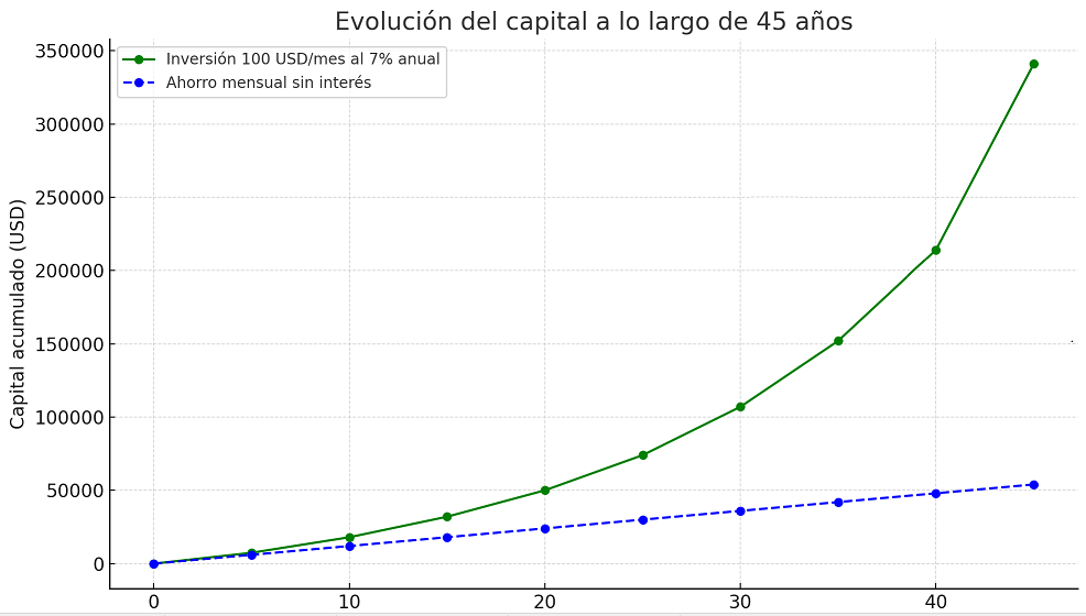 Después de 45 años de constancia, tu capital podría crecer aproximadamente a USD 340.000, con los intereses acumulados.