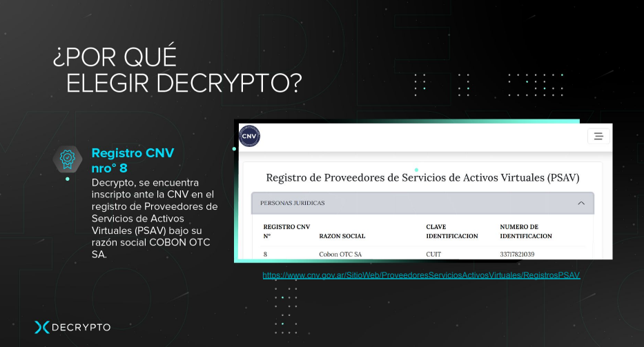 Lo que te ofrecemos hoy, es DESCRYPTO una Plataforma de inversión y gestión de criptomonedas en Argentina que te permite generar una renta pasiva en dólares de alta seguridad y hacer transferencias al exterior, regulada por la Comisión Nacional de Valores de Argentina, lo que nos dá mayor seguridade en la inversión.