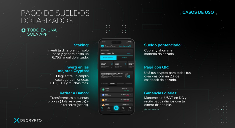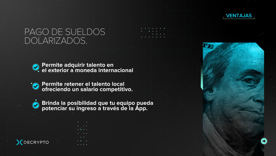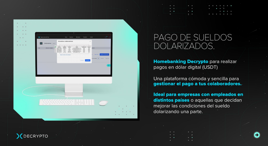 - Tendrás un Homebanking para dolarizar (USDT) el sueldo de tus empleados.